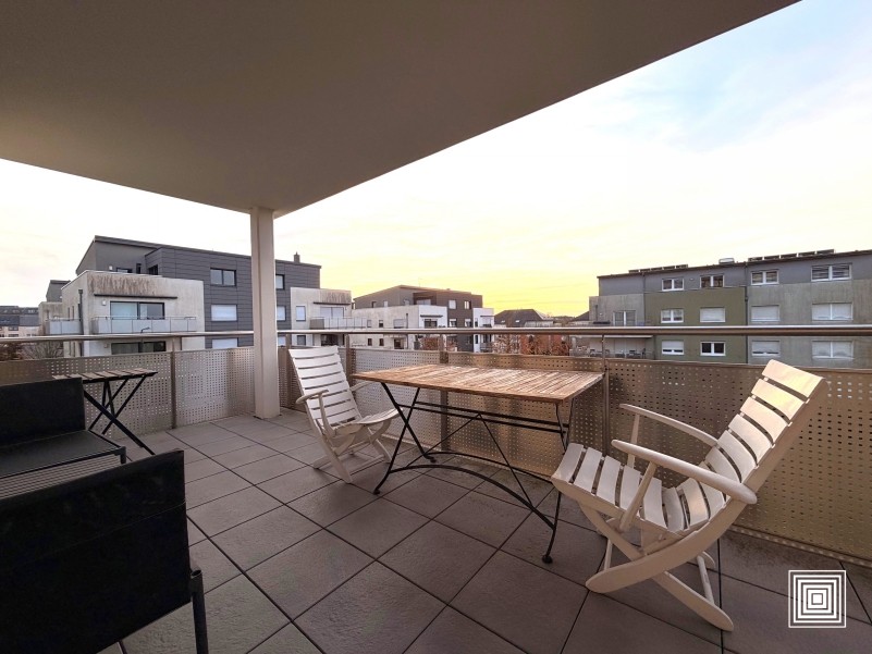 Appartement, dans quartier résidentiel, proche du centre-ville, hall, living, cuisine américaine équipée, balcon, 2 chambres à coucher, salle de bains, WC séparé, buanderie, cave, parking.