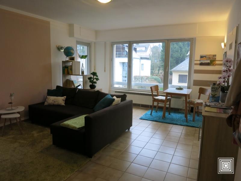Appartement, en parfait état, à 10 min du centre-ville, hall avec placard, living, cuisine équipée, balcon, 1 chambre à coucher, salle de bains avec WC, cave, garage-box fermé.