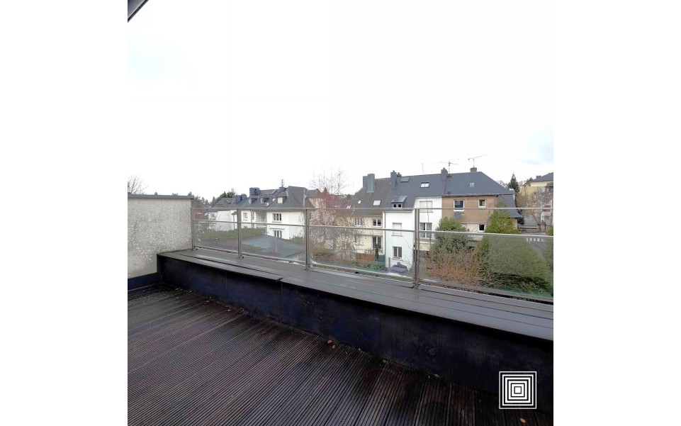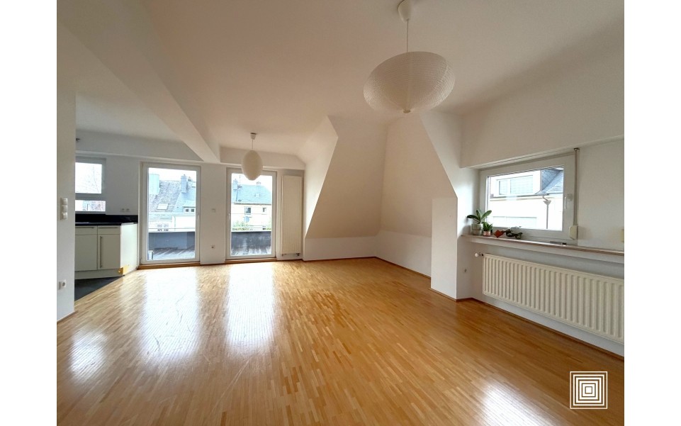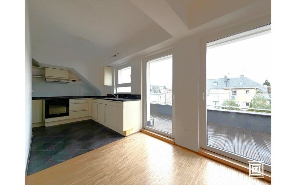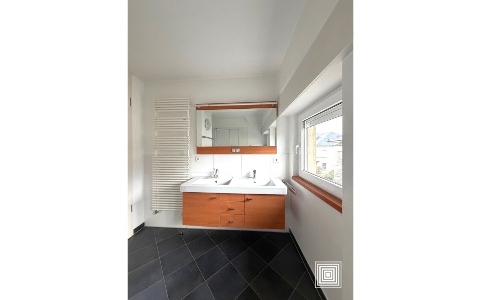 Duplex, proche du centre-ville, dans quartier résidentiel, avec beaucoup de charme, hall, living, terrasse, cuisine américaine équipée, 2 chambres à coucher, bureau, salle de bains, buanderie, cave.