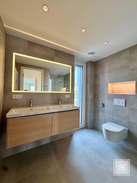 Appartement, nouvelle construction, accès facile, lumineux, finitions de haut niveau, hall, vestiaire, living, cuisine américaine équipée, débarras, 2 chambres à coucher, salle de douches avec WC, WC séparé, grande terrasse, buanderie, cave, parking intérieur.
