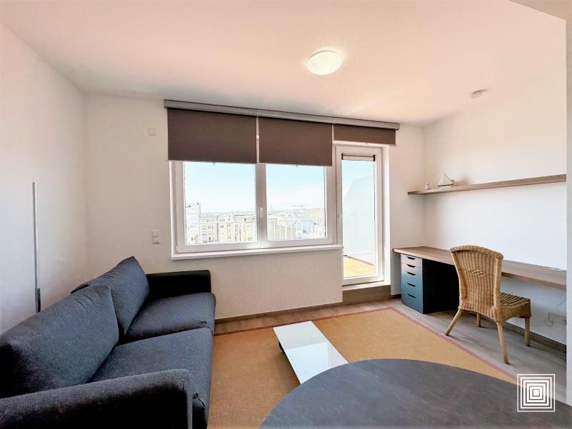 Penthouse, lumineux, entièrement rénové, 9e étage, ±47 m2, ascenseur, hall, living, cuisine, 1 chambre à coucher, salle de douches, 2 terrasses, vue dégagée, bail existant.