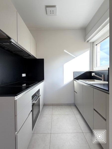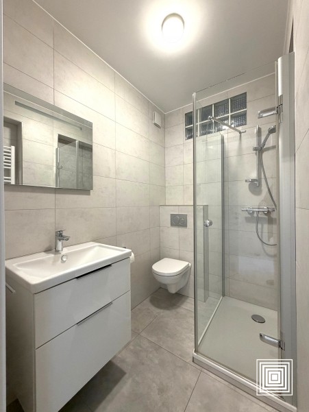 Appartement, lumineux et moderne, entièrement rénové, situé à l'arrière de l'immeuble, accès facile, hall avec vestiaire, living, cuisine américaine équipée, 1 chambre à coucher, salle de douches avec WC, cave, buanderie, garage. POUR UNE SEULE PERSONNE
