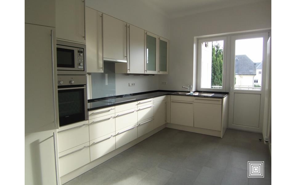 Appartement, proche du centre-ville, dans quartier résidentiel, entièrement rénové, avec beaucoup de charme, ±110 m2, hall, placard, living en L, balcon, cuisine équipée, 2 chambres à coucher, dont 1 avec salle de douches communicante, salle de bains, WC séparé, cave, garage.