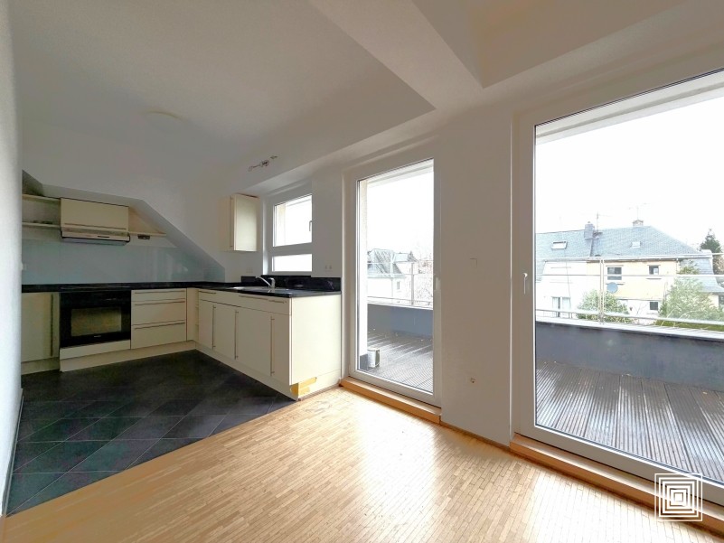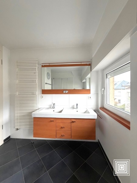 Duplex, proche du centre-ville, dans quartier résidentiel, avec beaucoup de charme, hall, living, terrasse, cuisine américaine équipée, 2 chambres à coucher, bureau, salle de bains, buanderie, cave.